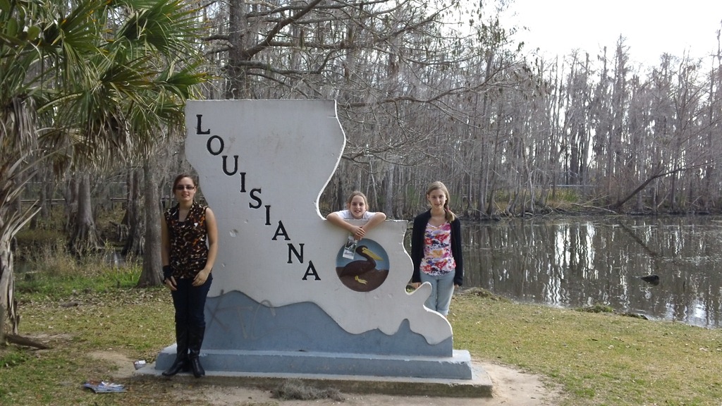 As we crossed the border into Louisiana today, the terrain once again became very different. Our first stop was at a visitor’s center just inside our new state. We didn’t see any of the alligators that live in the swamp behind the buildings but we did see some very large frogs jumping in the water. There were a lot of fire ant hills to avoid and a couple of signs that said, “Beware of Snakes!” (Yikes!!!) Even though the trees are drab and without leaves, the abundant Spanish Moss added to the beauty of the water and the very green grass. On the way to our campground we saw a lot of rice and sugarcane fields. We are definitely in the deep south and we can’t wait to do some exploring!